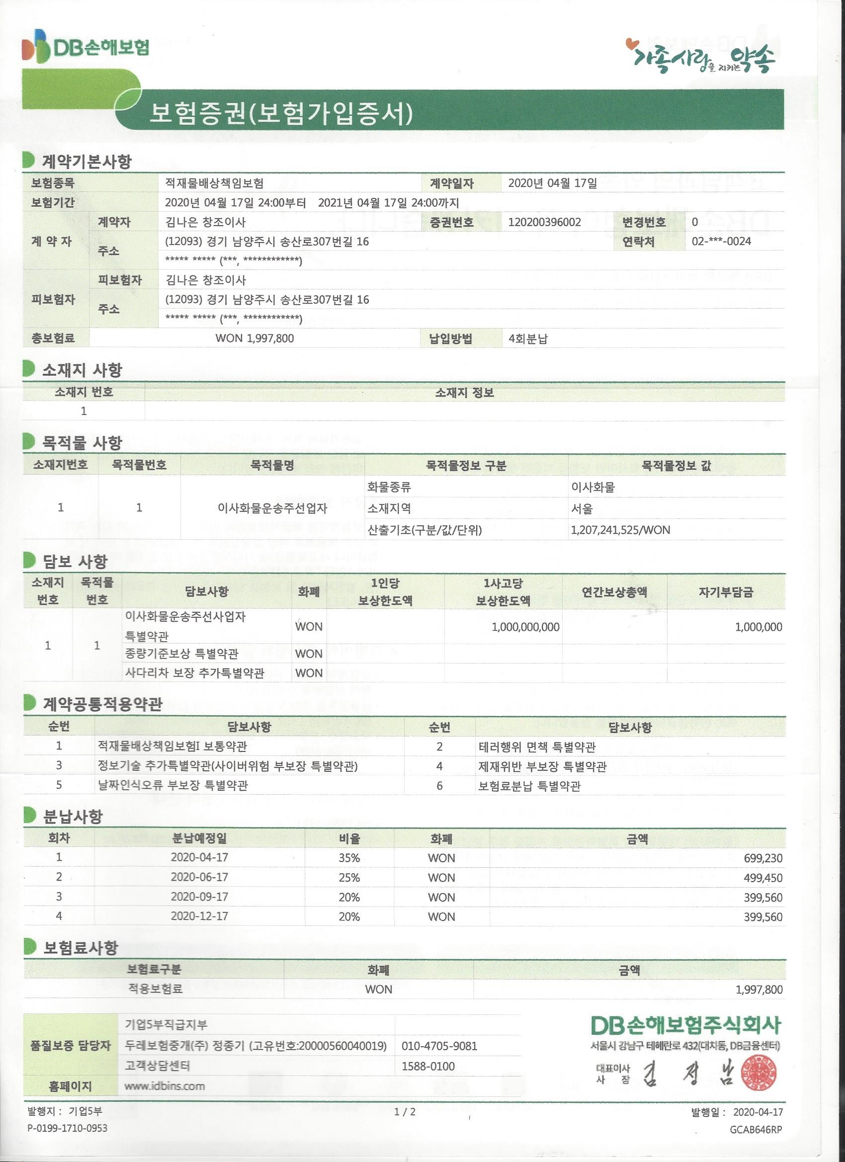1사고1사고당 보상한도액: 1,000,000,000(원)